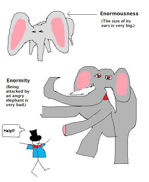 In several news articles, both tabloid and mainstream, this huge event is described as an “enormity.” Enormity means something of large size, but in the sense that it is terrible. Enormous or enormousness is the right term for when you want to say something is very large. The distinction is subtle, and some are allowing the usage difference to be broken down by common usage, even the mighty Oxford dictionary. I think that’s an enormity. An enormous elephant of misused usage stomping on the Queen’s English? You decide.