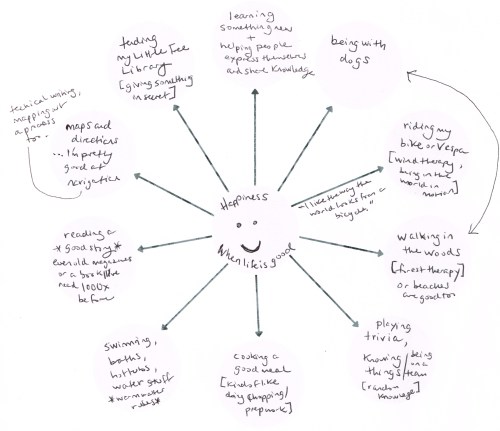 After looking at my mind map for awhile, it occurred to me that I wasn’t necessarily happiest when expressing myself (as perhaps I “should” as a writer), but when moving about or learning/using knowledge (winning trivia is always fun). I like being able to share knowledge with others, whether that’s tending to my Little Library or editing someone’s work, or giving directions or writing a process that helps someone do something. In my own arm’s-length, good-deeds-in-secret kind of way, I like making people happy.